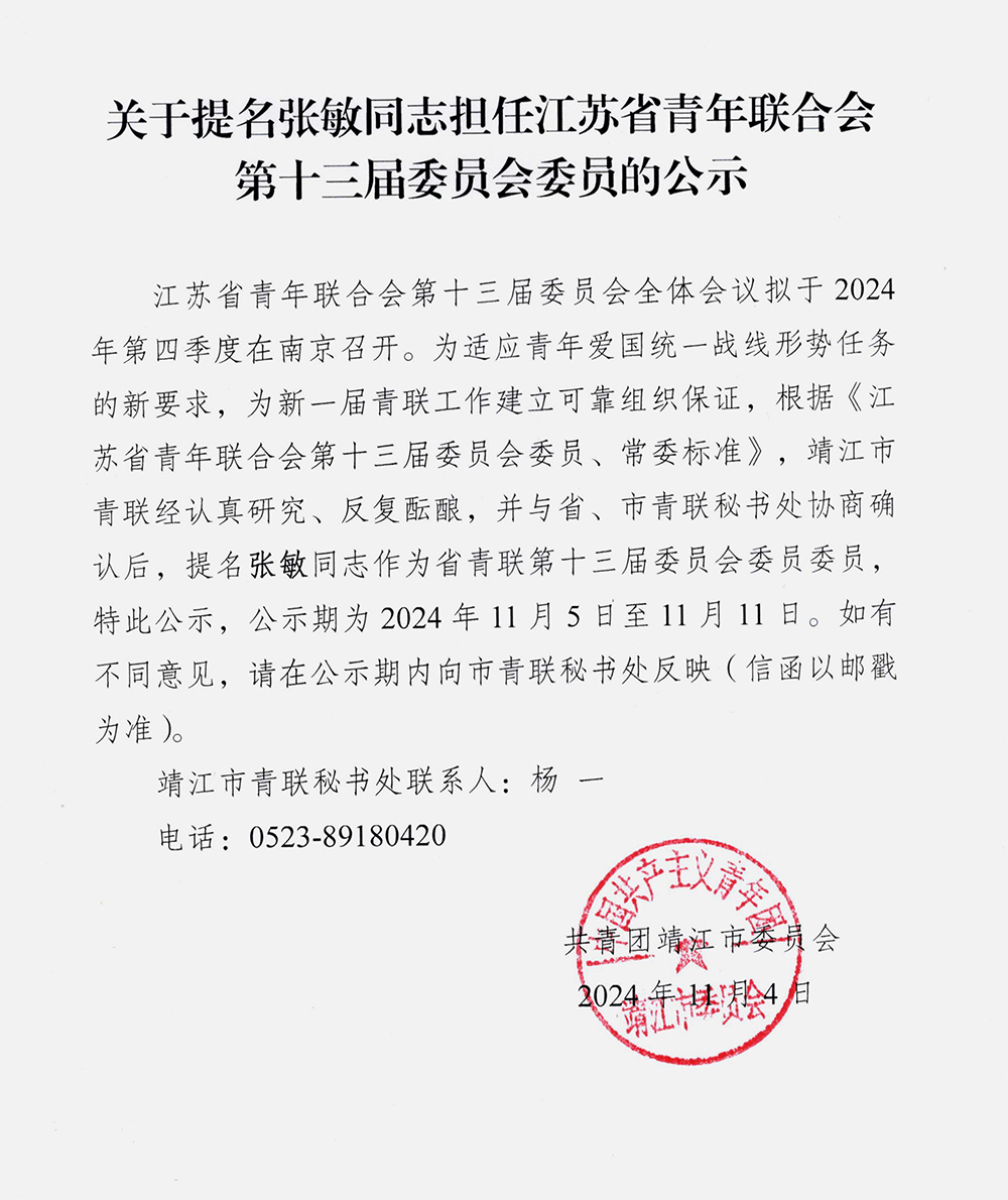 江蘇省青年聯(lián)合會第十三屆委員會全體會議擬于2024年第四季度在南京召開。為適應(yīng)青年愛國統(tǒng)一戰(zhàn)線形勢任務(wù)的新要求,為新一屆青聯(lián)工作建立可靠組織保證,根據(jù)《江蘇省青年聯(lián)合會第十三屆委員會委員、常委標準》,靖江市青聯(lián)經(jīng)認真研究、反復(fù)醞釀,并與省、市青聯(lián)秘書處協(xié)商確認后,提名張敏同志作為省青聯(lián)第十三屆委員會委員委員,特此公示